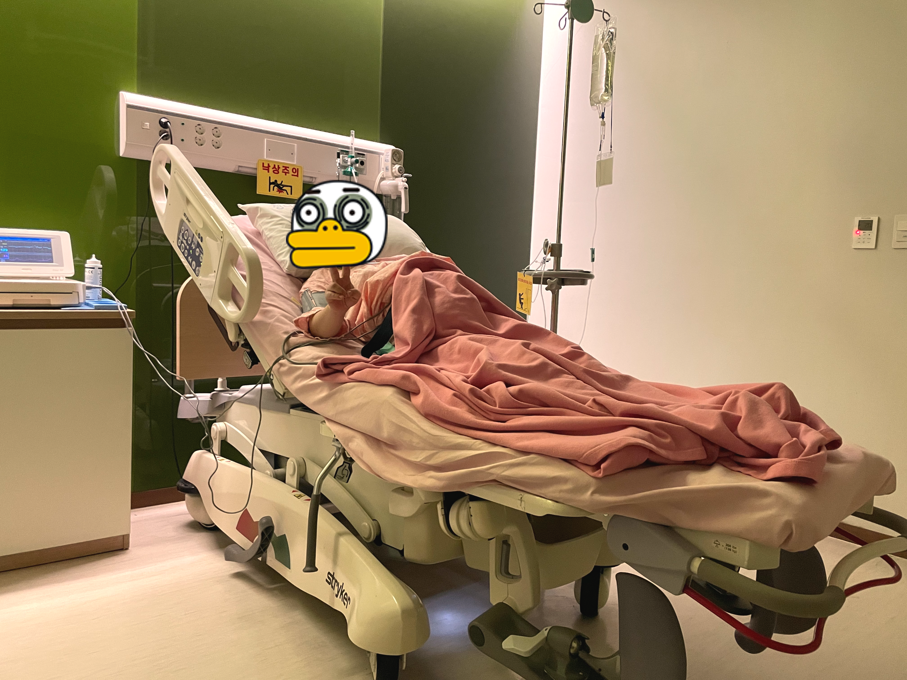 제 담당선생님께서 오늘 하필 안나오셔서 다른 의사선생님께 진료를 받았어요. 태동검사를 먼저 진행하고 현재 분비물이 양수인지 아닌지에 따라 출산의 여부가 결정돼서 검사지로 검사를 했는데 역시나 양수가 맞아서 바로 입원수속을 밟았어요. 지금은 코로나 검사를 하는 줄 모르겠지만 입원 전 코로나 검사를 진행하고 결과가 나올 때까지 기다리며 부모님께 전화를 드렸는데 엄마가 끝내 우셔서 마음이 아팠어요. “잘 끝내고 올게”라는 말씀을 드리고 남편에게 조리원와 병동에서 사용할 물품이 들어있는 캐리어와 출산할 때 필요한 것들(충전기, 세면도구, 담요 등)을 챙기고 오라고 전했어요.